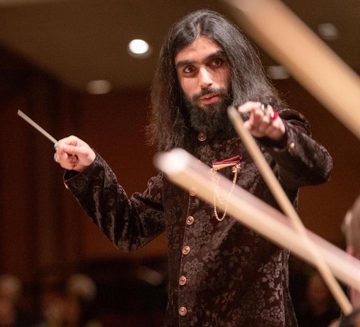 After intermission Afghan composer and conductor Milad Yousufi took charge as the ring-master of his composition Freedom. The work chronicles the arrival of an young Afghan boy to America and is accompanied by a carnival of colorful paintings that are projected on a screen overhead. These images highlight various cultural motifs and iconography reflective of Yousufi’s cultural background — one such example projects women in hijabs against the backdrop of Arabic lettering across a spiral of saffron reds and mustard yellows.