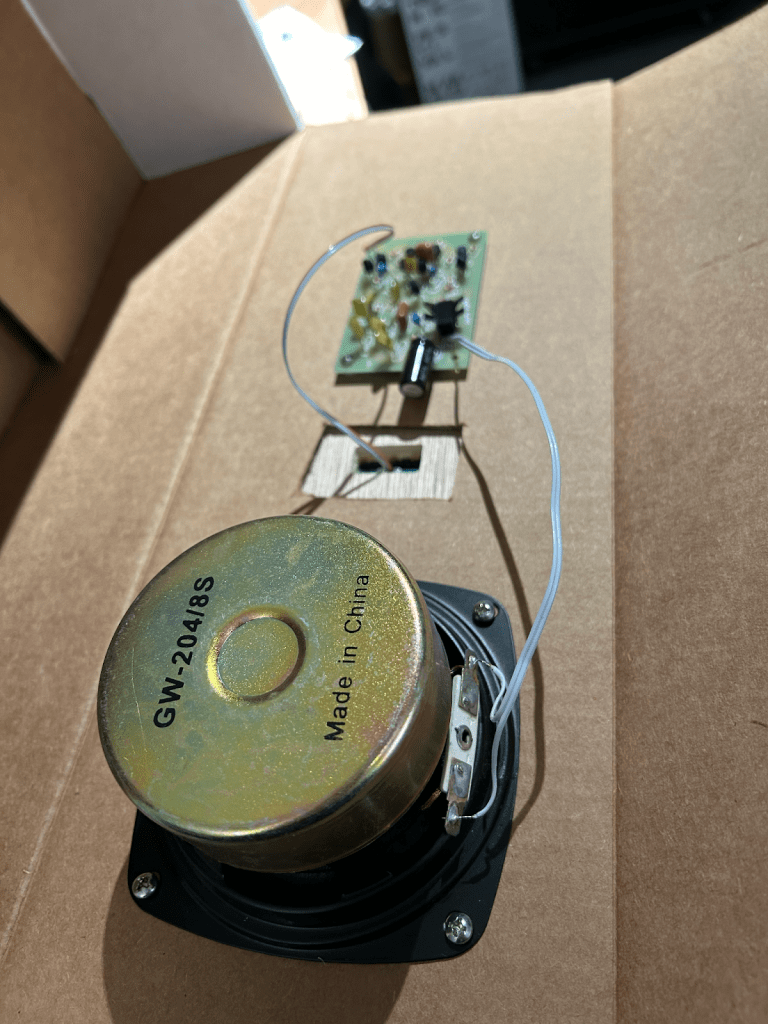 Impressive still is the integration of the eclipse itself into the concert. The dancers will be moving Fishkin’s Solar Sounders through the performance space as the light changes. The sound generated by a Solar Sounder changes based on how much sunlight it’s receiving. Fishkin’s Solar Sounders are made out of wood, but the example instrument Kemper showed me was from a kit worked on by students, composed of a cardboard box, a solar panel, a circuit board with an amplifier, a capacitor, and a speaker. Fishkin will be contributing several iterations of Solar Sounders, all making different sounds: pulsating, drones, et cetera.