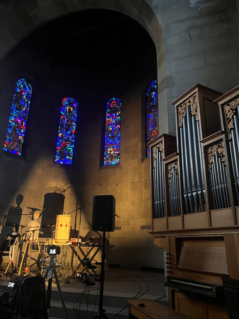 If Oberlin Conservatory’s Technology in Music and Related Arts (TIMARA) program were to be described in one word, “unconventional,” would likely be a top candidate. Upon arriving in Fairchild Chapel on the evening of March 13, 2025, it was clear that Fae Ordaz’s junior TIMARA recital would live up to this reputation. On stage was a beautiful gallery of handmade instruments connected by a network of pulleys and ornamented with sculptures, portraits, and a haunting shadowy backdrop. The visual aesthetic of this setup was worth admiring on its own, yet the real intrigue lay in exactly how Ordaz’s storytelling would proceed.