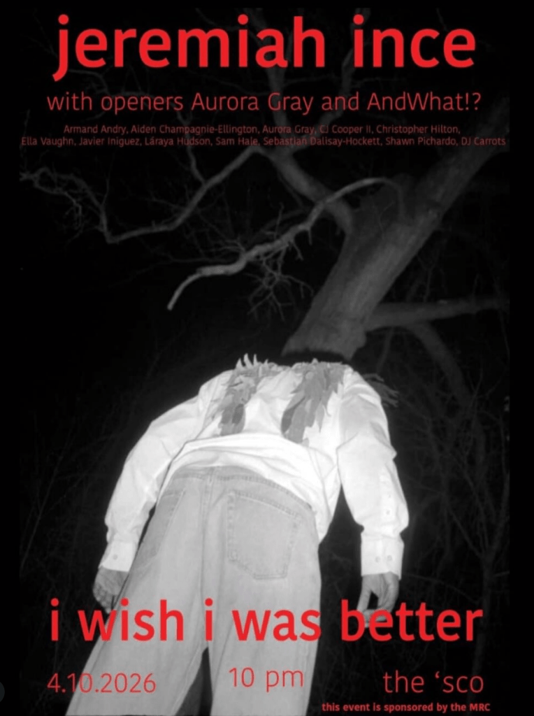Featuring DJ Carrots, guitars, drums, bass, and vocalists, the show is a much bigger undertaking than previous performances. Ince has been working to become as big as he knows he will be, and creating this album has allowed him to explore some of the potential consequences of fame. When I sat down with Ince in Mudd Library, he said “I know I’m going to be at the level that I want to be no. That is not a question. It’s more like, what if I become the worst version of myself? And that’s what I’m trying to tackle with this.”